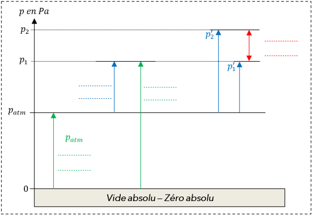 La pression absolue \(p_{\mathrm{abs}}\) est donc la pression par rapport à la pression zéro dans le vide.