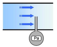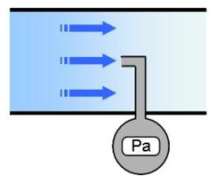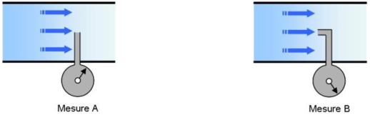 La pression statique est mesurée par un équipement disposé perpendiculairement à la direction d'écoulement du fluide.