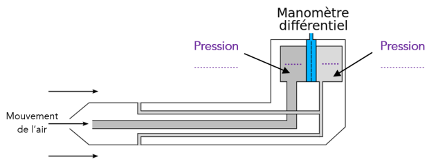 Q7. (APP) Sur le schéma simplifié d'un tube Pitot ci-dessous, indiquer (au bout des deux flèches) quels sont les différents types de pression mesurées.