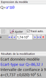 Q5. Tracer et modéliser la courbe représentant \(Q\) (l'énergie thermique reçue par l'eau assimilée à l'énergie électrique consommée par le thermoplongeur) en fonction de la variation \(\Delta \theta\) de température.