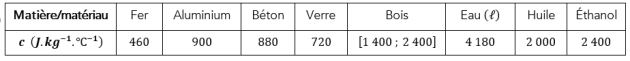 \(c\) : capacité thermique massique \((en \; J.kg^{-1}.^\circ \text{C }^{-1}\) ou \(\; J.kg^{-1}.K^{-1} )\)