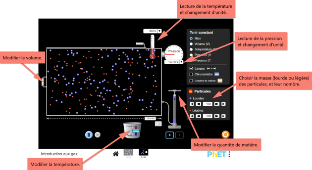Utiliser l'animation du lien suivant et familiariser vous avec pendant 5 minutes : https://phet.colorado.edu/sims/html/gases-intro/latest/gases-intro_fr.html