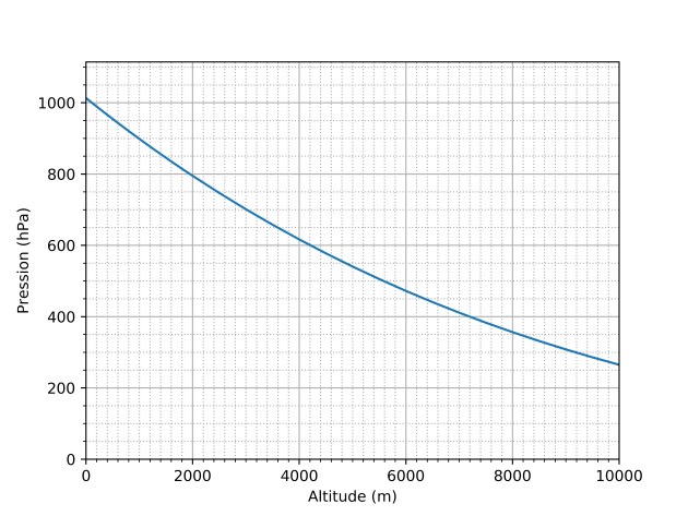 La pression (indiquée ici en hectopascals) est modifiée quand on s'élève en altitude. On suppose ici qu'il fait \(15\ \mathrm{^\circ C}\) au niveau de la mer, et que la pression y est de \(1013\ \mathrm{hPa}\) (valeur de la pression atmosphérique normale). Quand le temps change, la courbe change légèrement de forme.