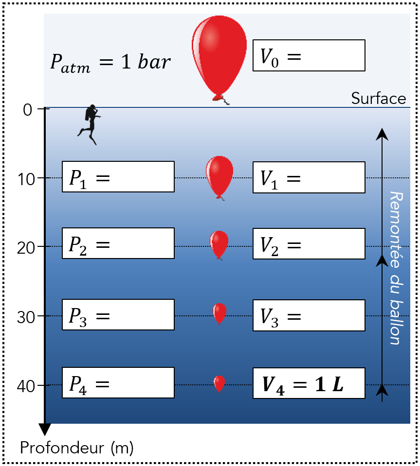 Q24. En sachant que la pression en profondeur augmente d’un bar tous les \(10\ \mathrm{m}\) et en exploitant la loi de Boyle-Mariotte, compléter le schéma ci-contre.