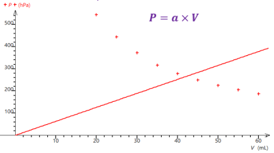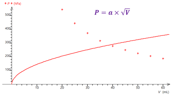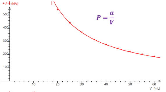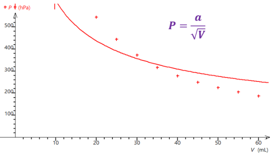 Le modèle le plus adapté est \(P=\dfrac{a}{V}\) car la courbe obtenue est la plus porche de l’ensemble des valeurs expérimentales.