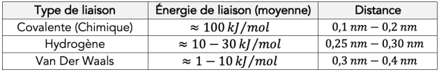 Q23. Justifier les faibles énergies de liaison des liaisons hydrogène et des interactions de Van Der Walls par rapport aux liaisons covalentes.