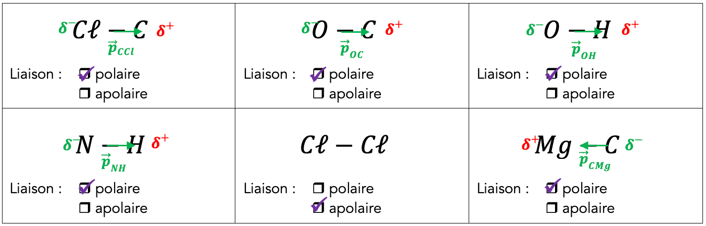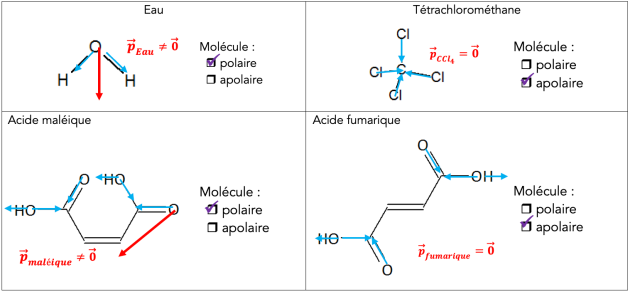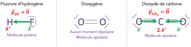 Si \(\vec{\ p}_\textit{molécule} = \vec{\ 0}\), la molécule est apolaire.