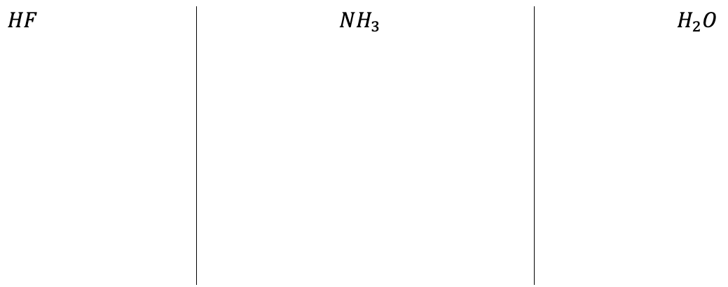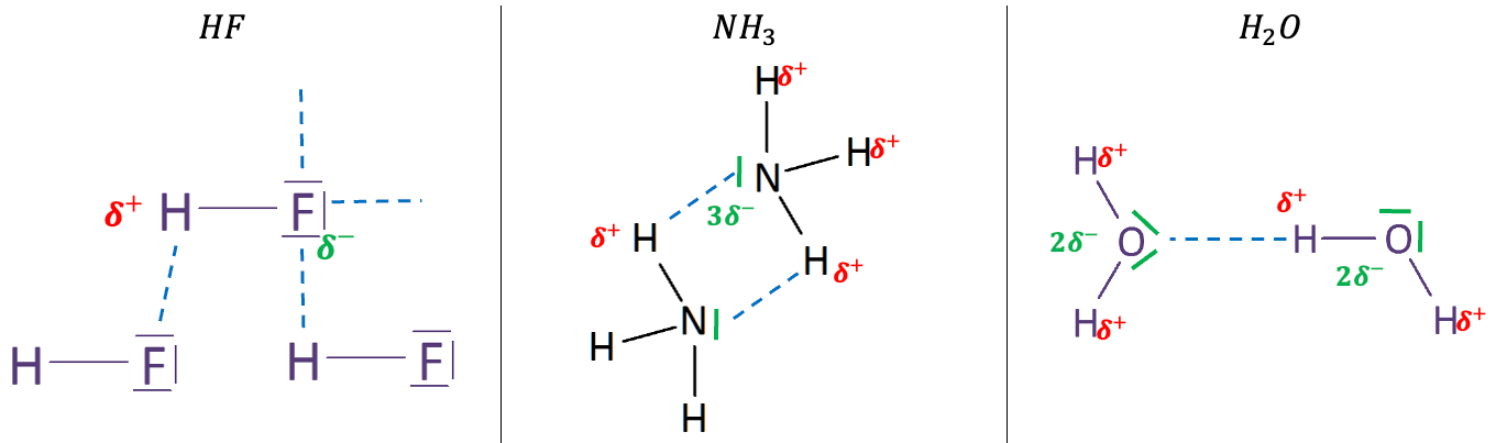 La température d’ébullition de \(\ce{NH3}\), \(\ce{H2O}\) et \(\ce{HF}\) est plus élevée, donc ces molécules sont plus fortement liées entre elles. Il existe donc un autre type de liaisons intermoléculaires.