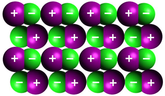 La liaison \(\ce{I-C\ell} \)est polarisée car le chlore est plus électronégatif que l’iode. Dans le cristal moléculaire, les molécules s’orientent de telle manière que l’atome d’iode (pôle \(+\)) soit toujours voisin d’un atome de chlore (pôle \(-\)).