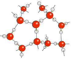 En pointillé sont représentées les liaisons hydrogène entre les molécules d’eau.