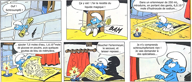 Pour simplifier, on dira que la réaction chimique rencontrée dans cette expérience est l’oxydation du glucose en ion gluconate \(\left(C_6H_{11}O_{7\ \left(aq\right)}^- \right)\) sous l’action des ions hydroxyde \(\left(HO_{\left(aq\right)}^-\right)\) et du dioxygène \(O_2\) de l’air. Il se forme aussi de l’eau.