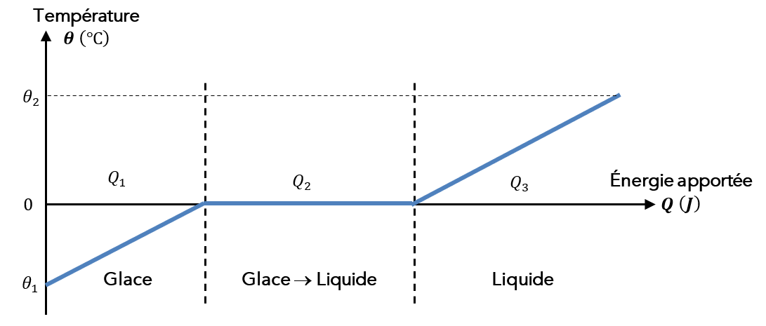La variation d'énergie interne des glaçons s'exprime donc : \(\mathrm {\Delta U_{\text{glaçons} }=Q_1 + Q_2 + Q_3}\).