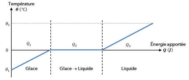 \({\color{red} Q_1=m_{\text{glaçons} } \times c_{eau, s}\times \left(\theta_2 -\theta_1 \right )=- m_{\text{glaçons} } \times c_{eau, s}\times \theta_1}\) car \(\theta_2=0\mathrm{^\circ C}\)