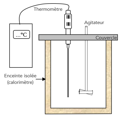 La quantité d'énergie échangée par le calorimètre sera calculée en utilisant sa capacité calorifique \(C_{calo} \; \left( \text{en } J.\mathrm{^\circ C}^{-1} \right)\) déterminée lors d'une activité expérimentale précédente.