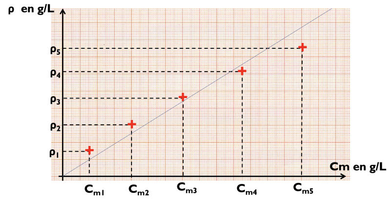 Solutions étalons : plus la concentration est grande, plus la masse volumique est grande aussi. Toutes les valeurs du tableau sont connues.