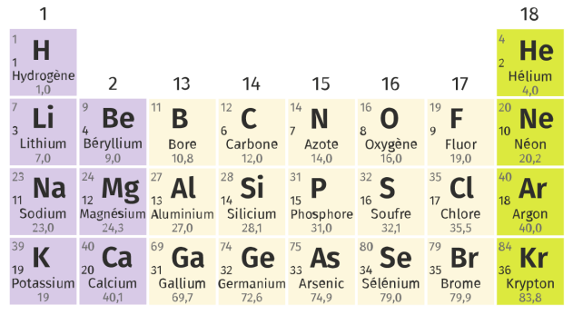 Structure électronique de l'ion stable | \(\mathrm{1s^2}\) | \(\mathrm{1s^2 2s^2 2p^6}\) | \(\mathrm{1s^2 2s^2 2p^6}\) |