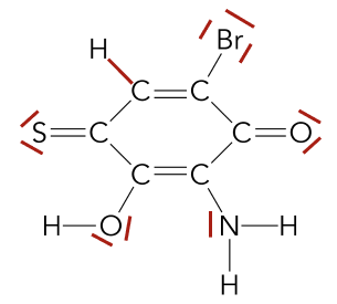 Les liaisons covalentes sont représentées avec un tiret reliant deux atomes, alors que les doublets non-liants sont représentés par un tiret encadrant un atome.