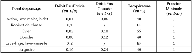 Ainsi, pour qu'un robinet soit fonctionnel il doit délivrer un débit minimal, ce qui implique d'avoir en amont du robinet une pression minimale qui dépend du point de puisage.