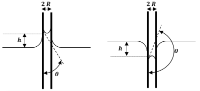 L'angle de mouillage \(\large \theta\) va déterminer si on a une remontée capillaire \(\large \left( \ h>0 \ \right)\) ou un descente capillaire \(\large \left( \ h<0 \ \right)\).