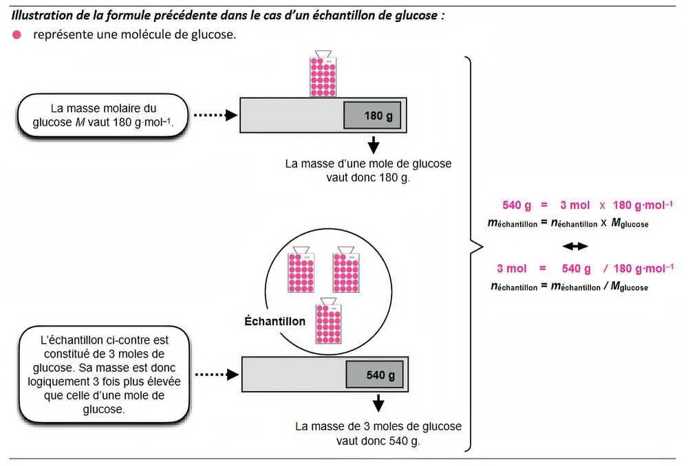 Pour un échantillon de masse  en , la quantité de matière , ou nombre de moles, vaut : \[\definecolor{grisRGB}{RGB}{225, 225, 225} {\fcolorbox{red}{grisRGB}{$ \begin{array}{rcl} \mathbf{\Large n = \dfrac{m}{M} } \end{array} $}}\]