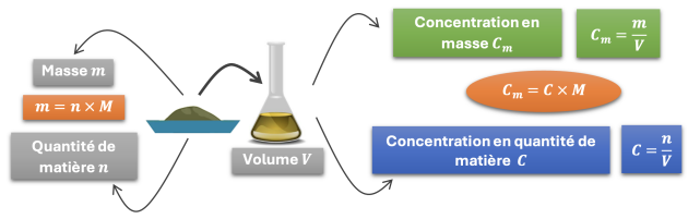 Cette masse de soluté contient une quantité de matière de soluté. On peut alors définir la concentration en quantité de matière de cette solution comme la quantité de matière de soluté contenue dans un litre de solution. Elle s’exprime en \(\mathbf{mol/L}\).