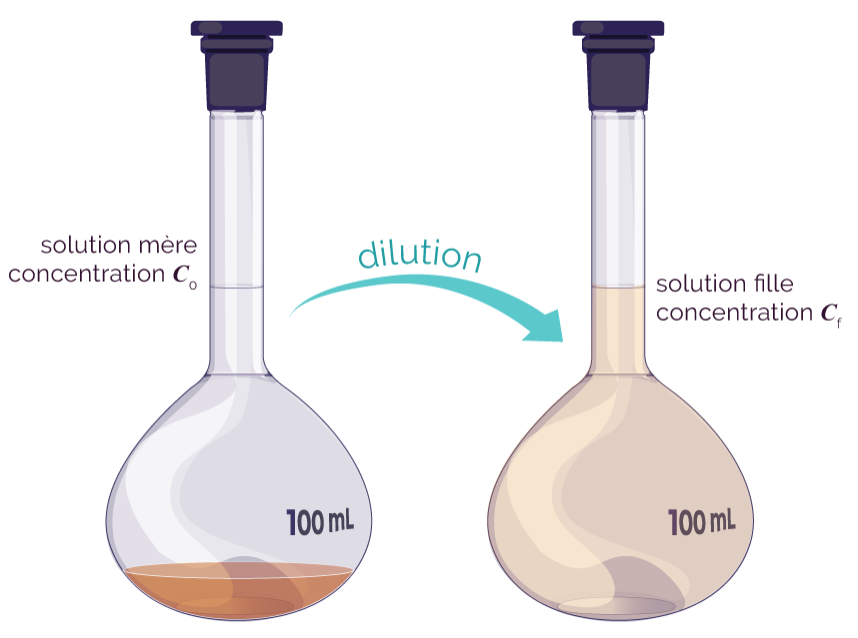 La dilution consiste à prélever un volume de la solution mère et à lui ajouter de l'eau distillée pour obtenir la solution fille.