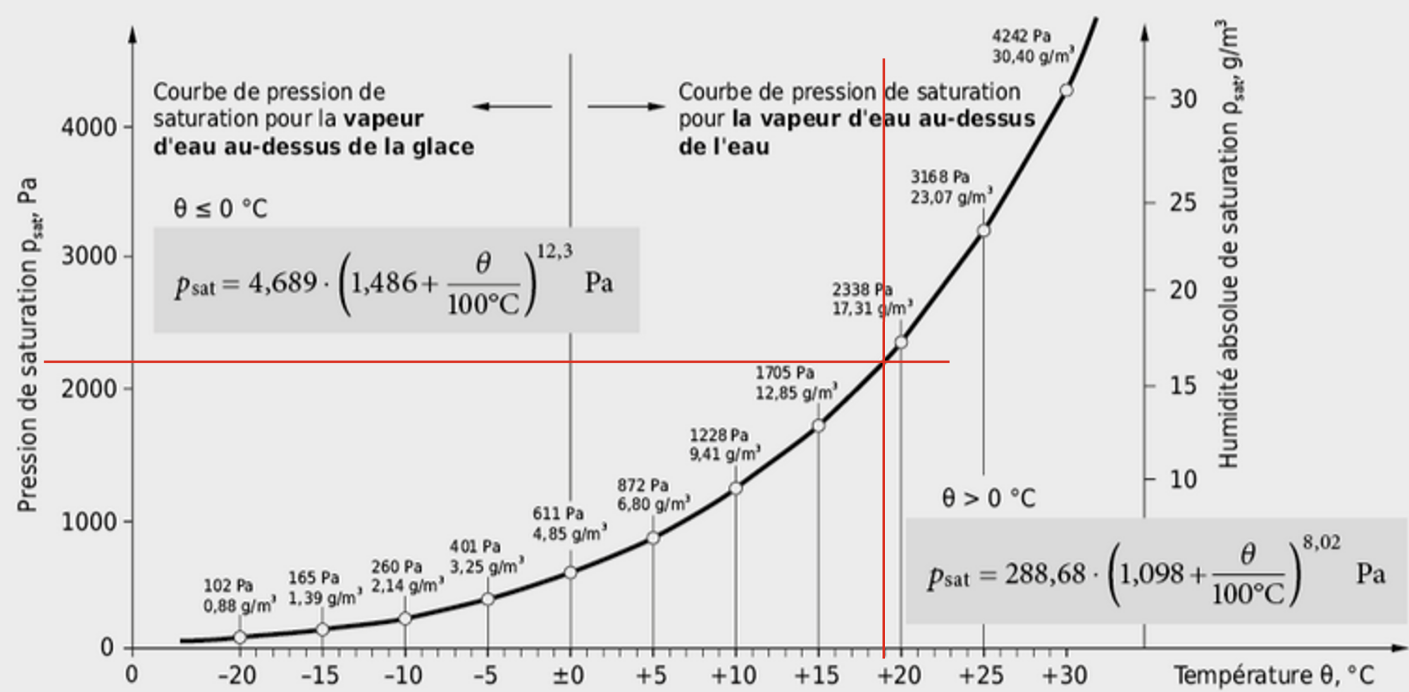 Pour une humidité relative de \(53\ \%\), on aura une pression de vapeur saturante de :
