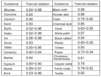 Dans les paramètres de la caméra thermique, différentes émittances sont renseignées :