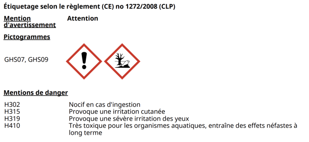 Le sulfate de cuivre est un produit irritant pour la peau et les yeux, ou pouvant provoquer une irritation cutanée ou oculaire. Il est également très toxique pour les organismes aquatiques, entraîne des effets néfastes à long terme.