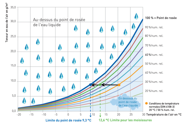 De l’eau de condensation peut être produite sur les surfaces intérieures dès que leur température de surface chute en dessous de la température du point de rosée de l’air du local.