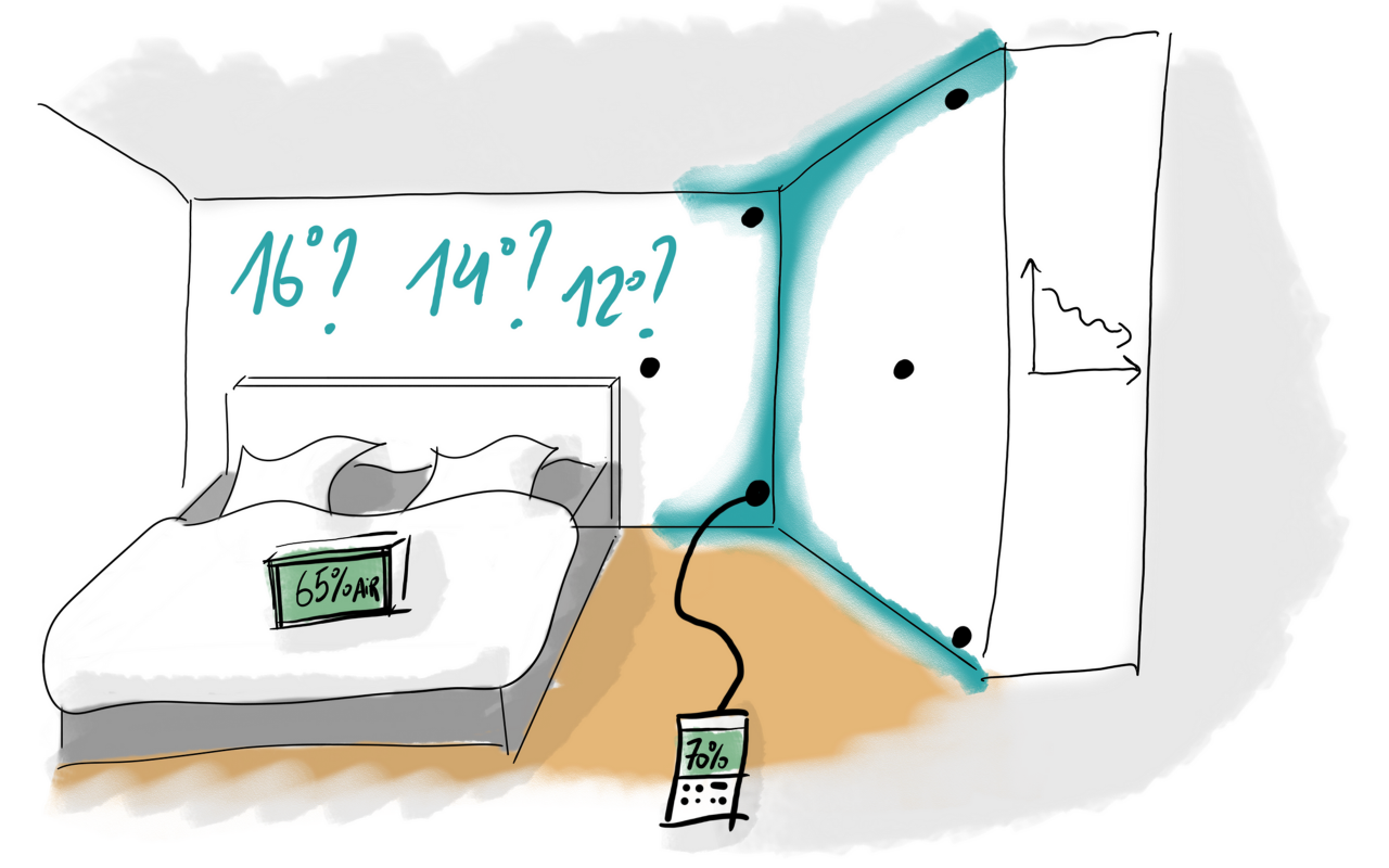 Humidité relative de \(90\ \%\), température ambiante de \(23\ \mathrm{^\circ C}\), mur à \(16\ \mathrm{^\circ C}\).