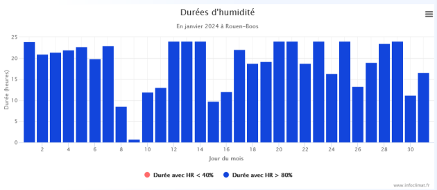 Pour diminuer la condensation, il faut diminuer le taux d'humidité relative de la piÚce car en janvier, le taux HR extérieur est trÚs important, supérieur à 80% quasiement toute la journée, sur le mois complet.