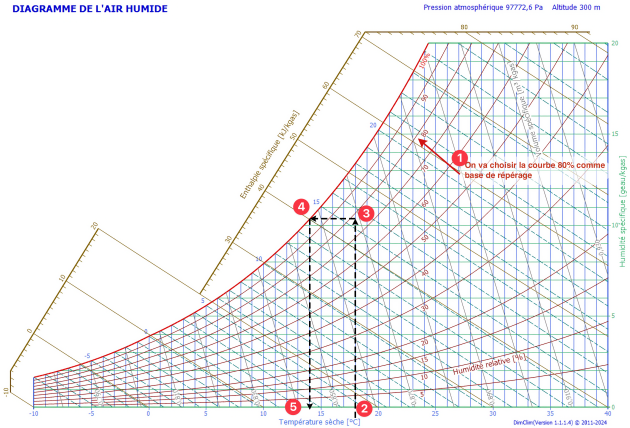 On choisit la courbe de l'humidité relative à suivre, ici celle des \(\varphi=78\ \%\) (on suivra celle à \(\varphi=80\ \%\) pour point de repÚre) ;