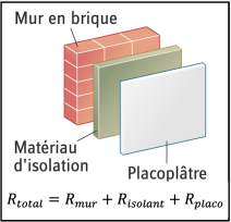 \[ \definecolor{grisRGB}{RGB}{225, 225, 225} \begin{array}{lcl} {\fcolorbox{red}{grisRGB}{$ {\Large \ \ \ \mathbf{ R = \dfrac{e}{\lambda} } \ \ \ } $}} & \textsf{ avec :} & \begin{array}{|rcl} {\large\ \mathbf{ R } } & \textsf{:} & {\textsf{résistance thermique de la paroi } \mathrm{m^2\cdot K \cdot W^{-1}} } \\ {\large\ \mathbf{ e }} & \textsf{:} & {\textsf{épaisseur du matériau en } \mathrm{m}} \\ {\large\ \mathbf{ \lambda }} & \textsf{:} & {\textsf{onductivité thermique du matériau en } \mathrm{W \cdot m^{-1} \cdot K^{-1}} } \end{array} \end{array}\]Remarque : Plus \(R\) est grand, plus le matériau est isolant.