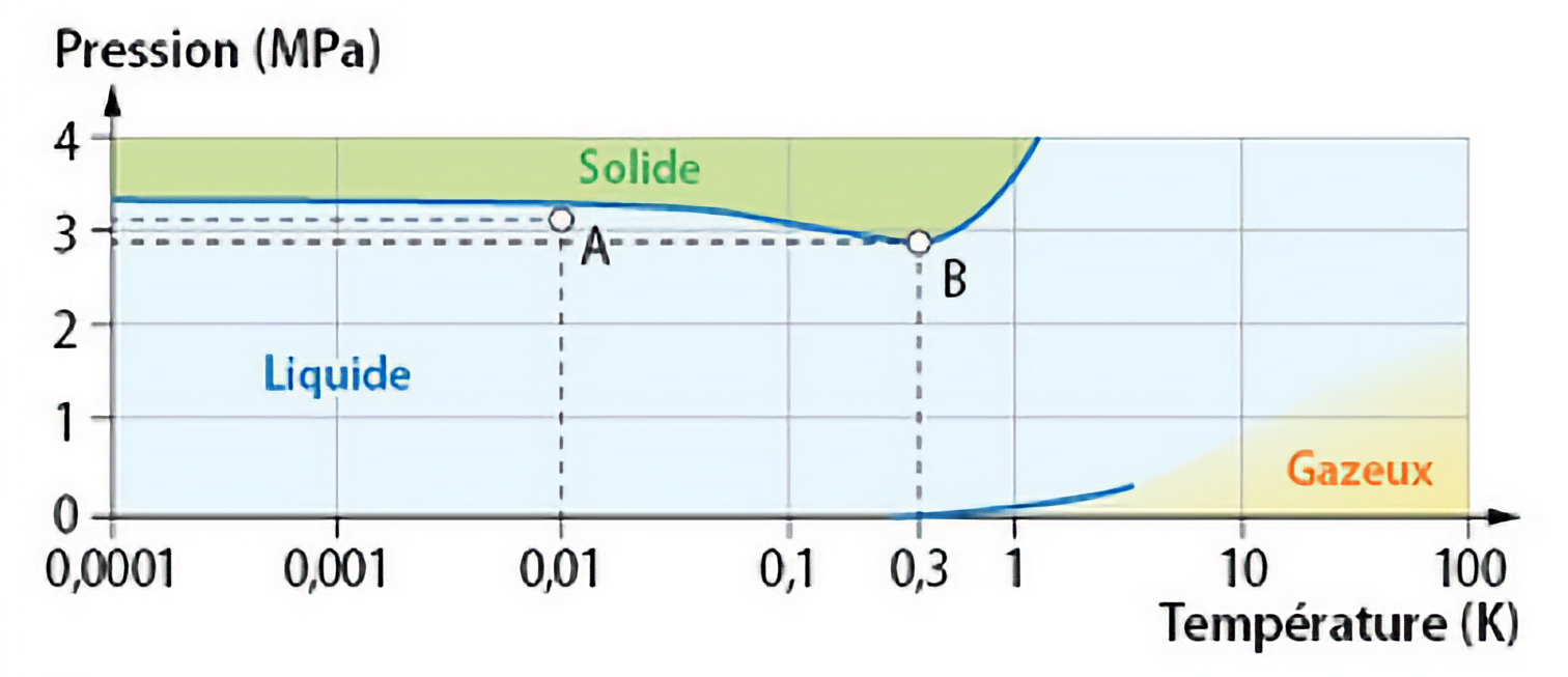 L'hélium 3 est l'un des isotopes de l'hélium. Cet isotope peu présent sur Terre, mais présent en plus grande quantité sur la Lune pourrait servir, dans le futur, comme combustible pour réaliser des réactions de fusion nucléaire. Son diagramme d'état ci-dessous montre quelques particularités.