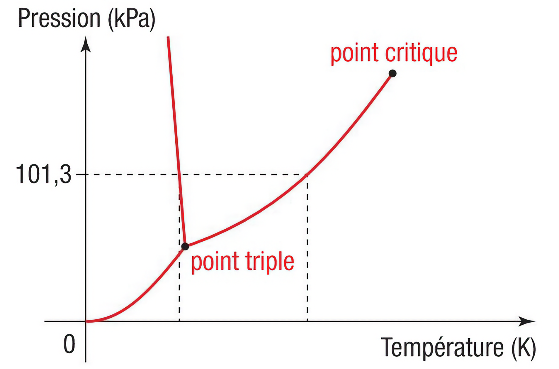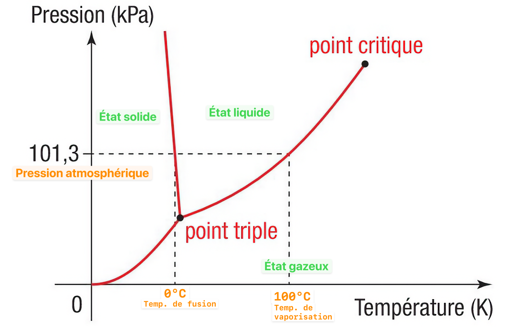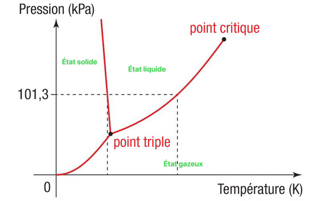 Point triple : C'est le point de la courbe où coexistent en équilibre les 3 états de la matière. Ici c'est à \(\left( 273,16\ \mathrm{K}\; ; \; 6,12\cdot 10^2 \ \mathrm{Pa}\right)\) (température de 0,01 °C).