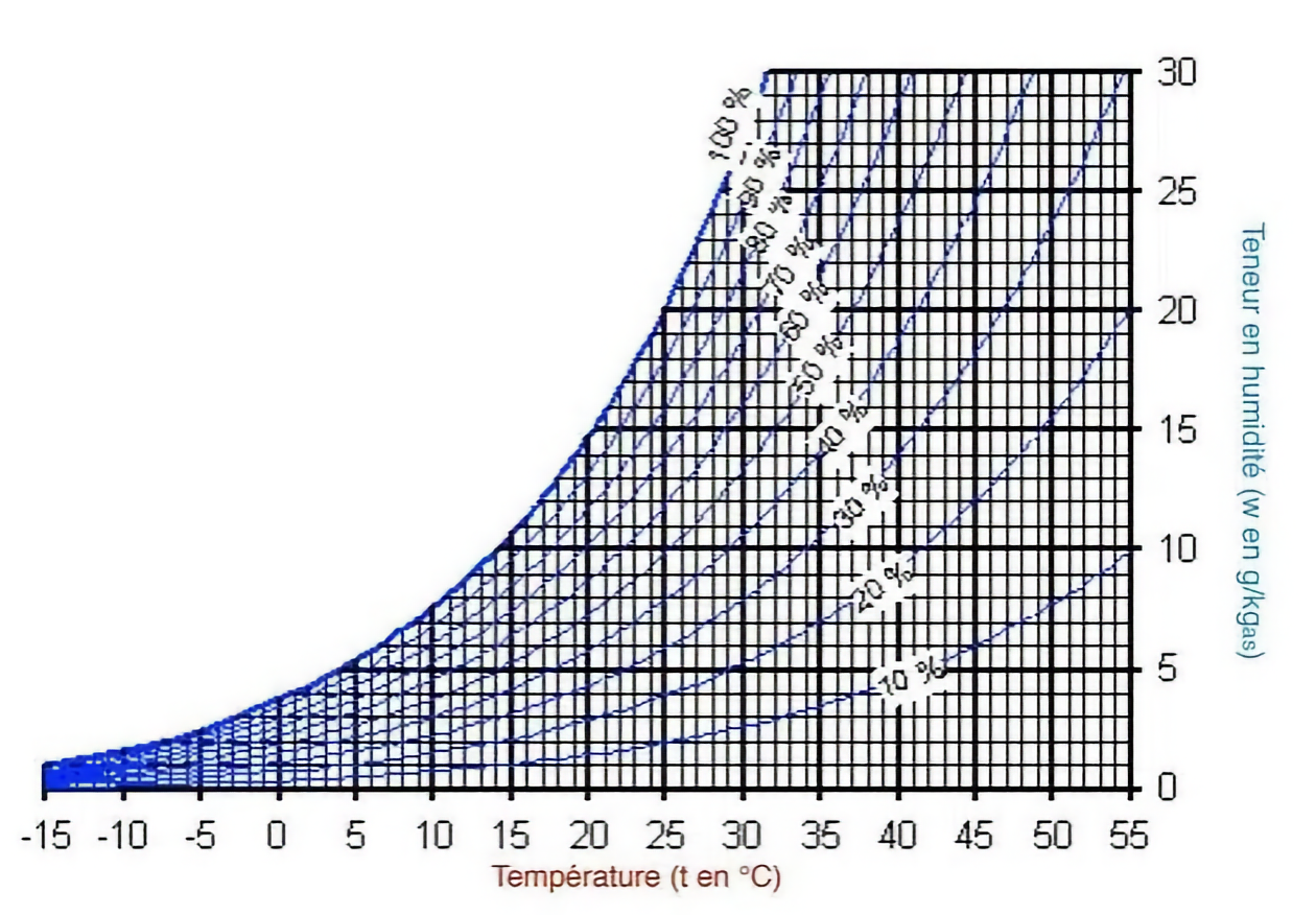L'humidité relative est donc de \(\mathbf{ \color{blue} 45,0\ \%}\).