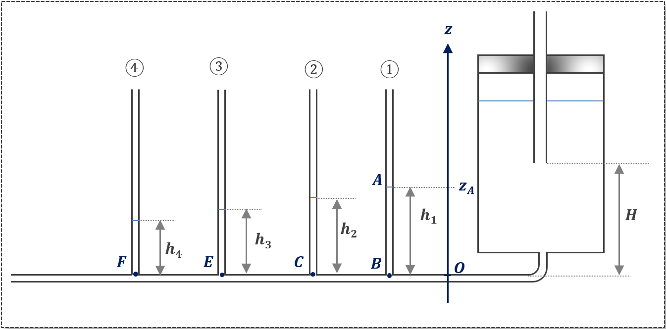 Si on prend le tube ①, la hauteur de montée d'eau \(h_1\) nous permet de déterminer une variation de pression entre le niveau de l'eau (point A) et le point de la canalisation au niveau du tube ① (point B).
