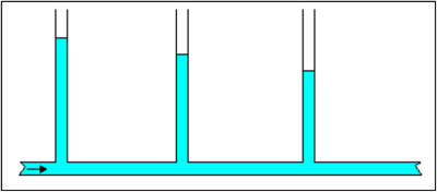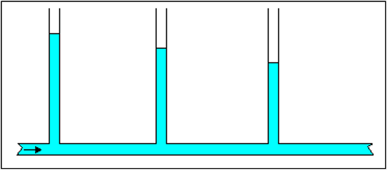Dans la canalisation représentée ci-contre, le liquide se déplace de la gauche vers la droite. La hauteur de liquide dans un tube vertical est d'autant plus faible qu'il est à droite : la pression dans la canalisation est plus faible à droite.