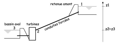 Une installation hydroélectrique comporte une retenue d'eau amont, trois conduites forcées parallèles de diamètre \(D=300\ \mathrm{cm}\) chacune, un ensemble de turbines, un bassin aval selon le schéma donné en annexe. Lors du turbinage, le débit-volume total est \(q_\mathrm{V}=217 \ \mathrm{m^{3}.s^{-1}}\).