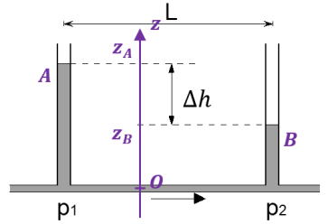 On définit un axe des altitudes avec un point A et B comme indiqués sur le schéma. On a alors \(z_1=z_2=0\) et \(\Delta h=z_{\mathrm{A}}-z_{\mathrm{B}}\) et \(p_{\mathrm{A}}=p_{\mathrm{atm}}=p_{\mathrm{B}}\).
