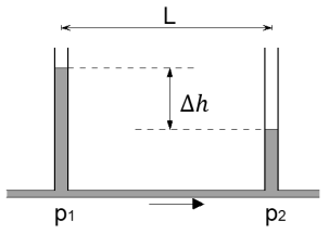 Pour mesurer la viscosité d'une huile, on utilise le dispositif schématisé ci-contre. On fait couler l'huile dans un tube horizontal de \(7,0\ \mathrm{mm}\) de diamètre et comportant deux tubes manométriques verticaux situés à \(L=600\ \mathrm{mm}\) de l'un de l'autre.