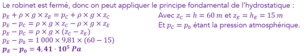 Q1. (RÉA) Calculer l'écart entre la pression de l'eau au niveau d'un robinet E situé à \(15\ \mathrm{m}\) de hauteur dans l'immeuble et la pression atmosphérique (on considère le robinet fermé). Justifier l'équation utilisée.