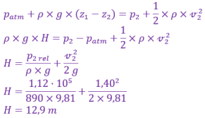 Q17. (RÉA) Appliquer la relation de Bernoulli entre les points 1 et 2 pour en déduire l'expression littérale donnant \(\large H\) en fonction de \(\large p_\mathrm{atm}\) , \(\large p_\mathrm{2\ rel}\), \(\large \mathrm{v}\), \(\large \rho\) et \(\large g\). Calculer numériquement \(\large H\).