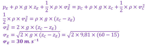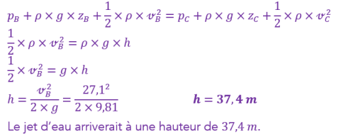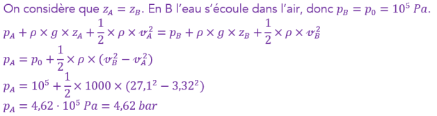 Aide : Utiliser l'équation de Bernoulli entre B et C, l'eau s'écoule dans l'air, donc \(p_\mathrm{B}=...\).
