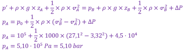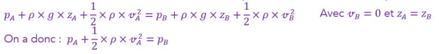 Q23. (ANA/RÉA) Si l'on fait l'hypothèse de l'absence de pertes de charge entre les points A et B, et que les points A et B sont à la même hauteur \(\large \left(\ z_\mathrm{A}=z_\mathrm{B}\ \right)\), écrire l'équation de Bernoulli entre les points A et B.