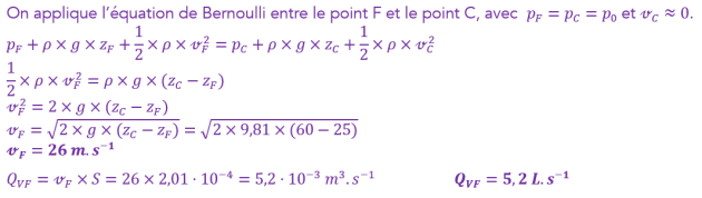 Valeur à trouver : \(\mathrm{v_F}=26\ \mathrm{m.s^{-1}}\) et \(\large Q_\mathrm{VF}=5,2\ \mathrm{L.s^{-1}}\)