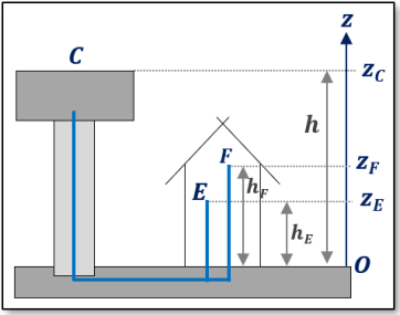 Un immeuble est alimenté par ce château d'eau. Le sol sur lequel sont construits l'immeuble et le château d'eau est horizontal (voir figure ci-contre). Deux robinets sont présents en E et F.