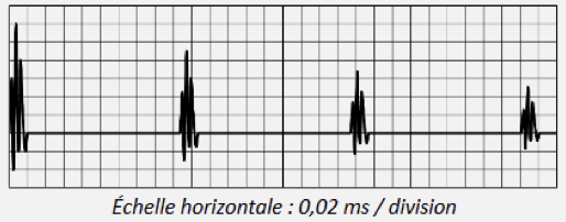 On peut ainsi voir 3 ondes réfléchies pour une durée de \(\Delta t=18\ \textsf{divisions}=28\times 0,02 \ \mathrm{ms}=5,6\ \mathrm{ms}=5,6\cdot 10^{-3}\ \mathrm{s}\).