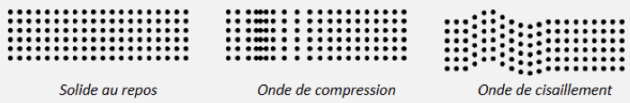 Le solide peut alors être le siège d'ondes sonores de deux types, appelées ondes de compression et ondes de cisaillement, représentés ci-dessous.